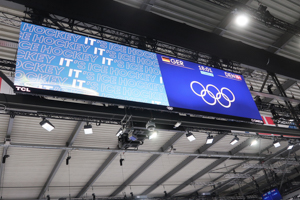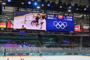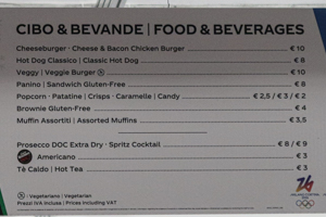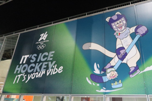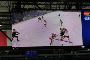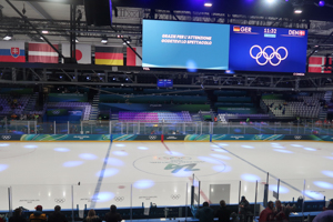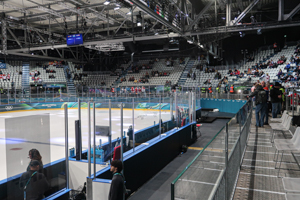 The whole arena and its facilities (apart from restrooms) at Rho Ice Hockey Arena were temporary. Thereby, the arena felt very packed, using the maximum of space available. This also meant that the sea width felt limited. However, seating was very comfortable compared to the Santagiulia situation. Pillars lead to quite a couple of seats with a restricted view on the ice. The setting with the screens around the ice was really nice. I also liked the signage of the different seats, rows and numbers, which was very handy. However, in my point of view, the capacity of the venue was not fit for purpose. I found numbers between 5,000 and 6,000 specators. However, most of the matches had an audience of roughly 4,000 – also due to the fact that some (good) seats over the center line were not sold to the public.