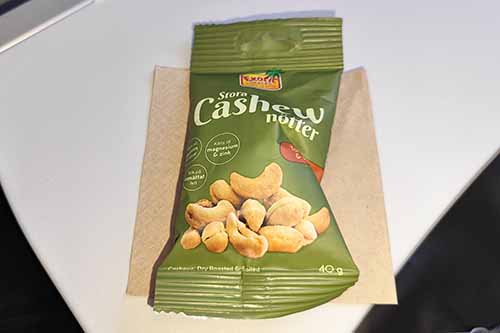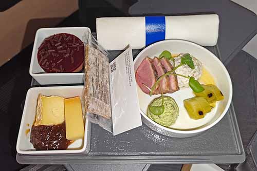 The last transfers in Copenhagen (CPH) were a bit of hectic. Reaching a quite distant gate, sometimes after a flight delay, made me have an intense and short time in Denmark. This time, it was way better. The cabin attendant in business class was absolutely lovely and charming. The food had a similar style. I really liked the starting crudite of carrots, cucumber and roasted hazelnuts. The sandwich this time was with grilled chicken, elderflower dressing and rhubarb. I preferred the salmon on the first flight – but this one was another really nice and also good-looking bite. The San Sebastian cheesecake already felt like a good, old friend – a lovely sweet delight. No issue having two of them – a vey enjoyable flight.