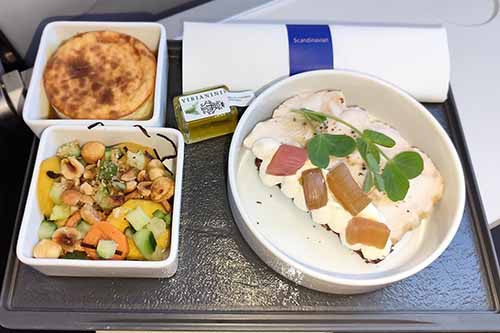The food on this short trip compensated a bit for that, at least. The red quinoa and cauliflower salad was nice. I absolutely loved the smorrebrod sandwich with torched salmon, miso mayonnaise and Szechuan pickled radish. The dessert was a treat as well – San Sebastian cheesecake with mango coulis. Thus, the culinary side of the flight experience with SAS was absolutely lovely.
