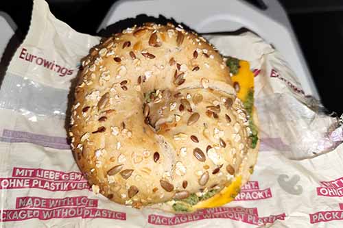 I had the same crew as on the inbound. The warm meal service was rather fast again, with a choice of chicken or vegetarian ravioli. I took the pasta, which is no culinary treat, but a solid meal. The chocolate cream was the same as on the outbound. As a snack thereafter, I went for the nice cookie and a Snickers, later followed by a salami tapas platter. As a passenger collapsed twice and had to receive treatment after a medical diversion to Antalya (AYT), the crew reduced the service thereafter – absolutely understandable and fine. Instead of the classic curry sausage, I just went for a bagel sandwich, which was really nice as well. Great work by the crew – one of the best ones I ever had. I even made a separate post about these flights afterwards.