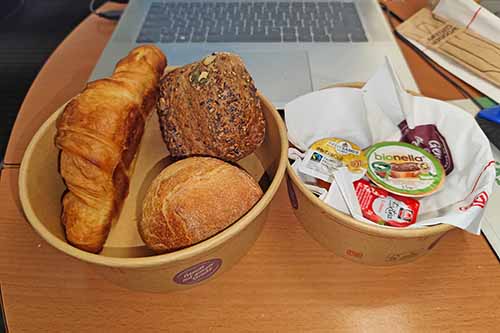 As the Ukraine vs. Hungary floorball match in Berlin was scheduled at noon, I had to take the very first Saturday morning train from Cologne to Berlin. At these times, breakfast options at Cologne Main Station are rather limited, so that I went for an additional breakfast in the train. The French Breakfast with two bread rolls and a croissant and some sweet addition costs 7.90 EUR. Ordering via the train WiFi in First Class was possible, which I generally appreciate. The service was really quick. The dishwasher in the train did not work, so that the food was served in disposable bowls. A really nice start of the day in the German high speed train.